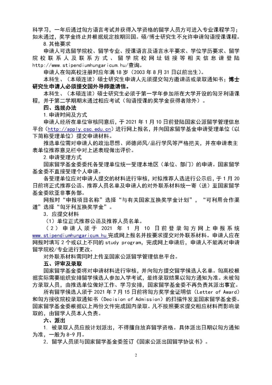 2021年度匈牙利互换奖学金网上申报时间为2020年12月20日-2021年1月10日,申请人须登录“国家公派留学管理信息平台”
